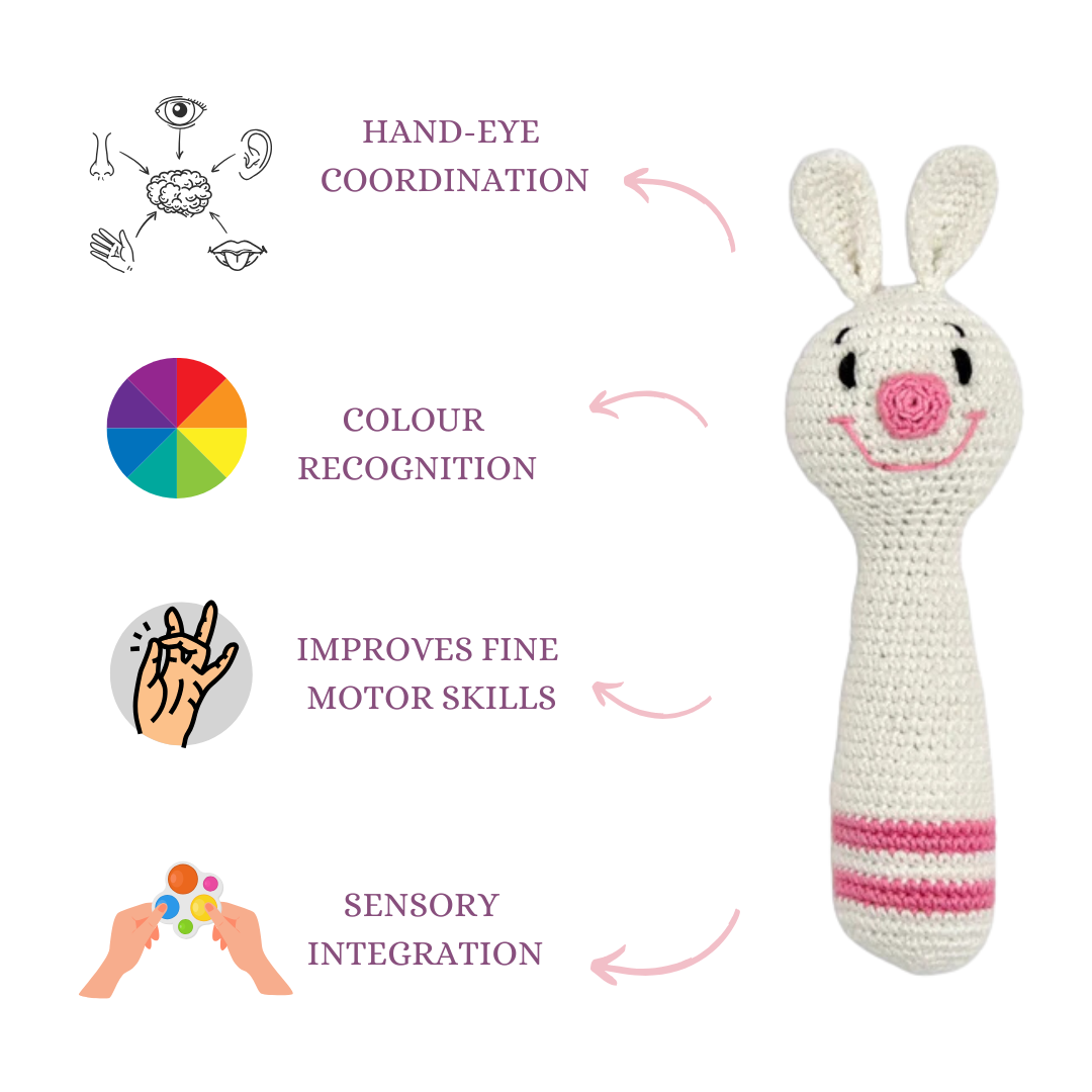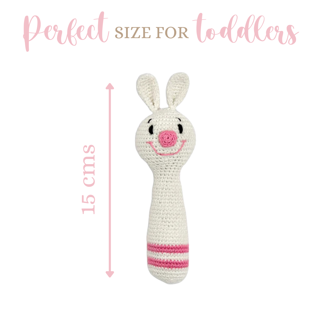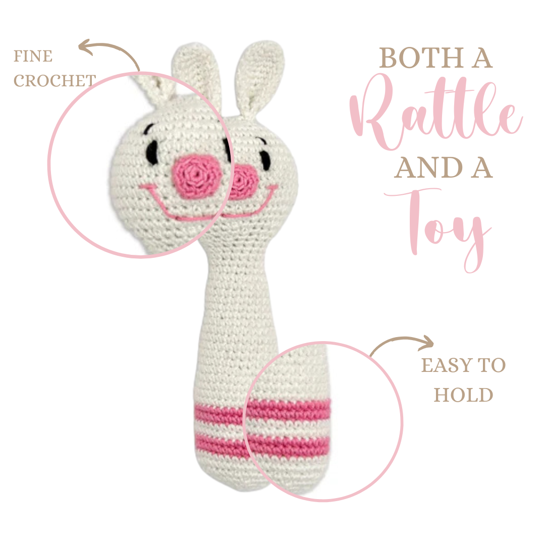 Delight your little one with our Cuddly Bunnies Crochet Hand Rattle & Teether, thoughtfully handmade to comfort, entertain, and soothe tiny hands and gums. Designed especially for newborns and infants, this adorable bunny rattle creates a gentle sound that stimulates hearing while encouraging early sensory development.