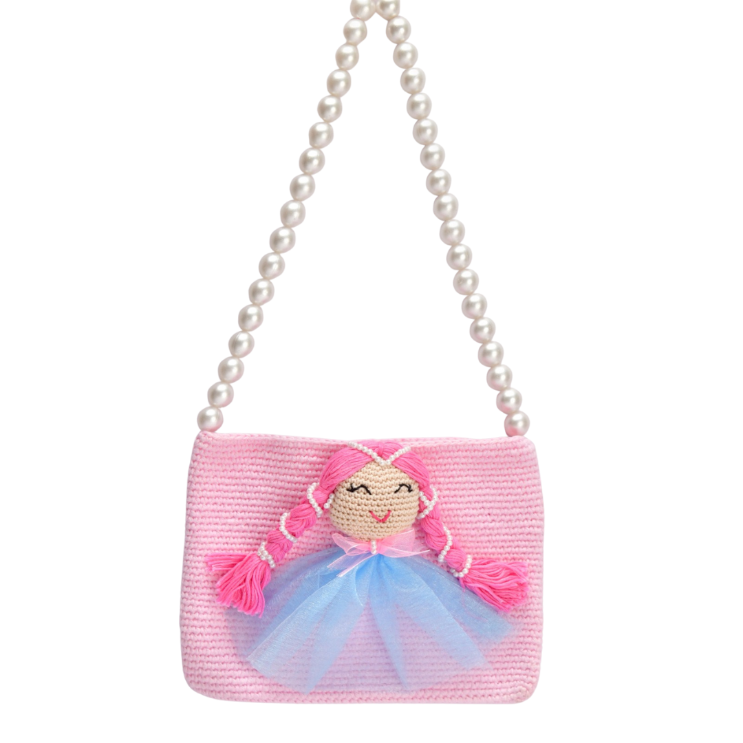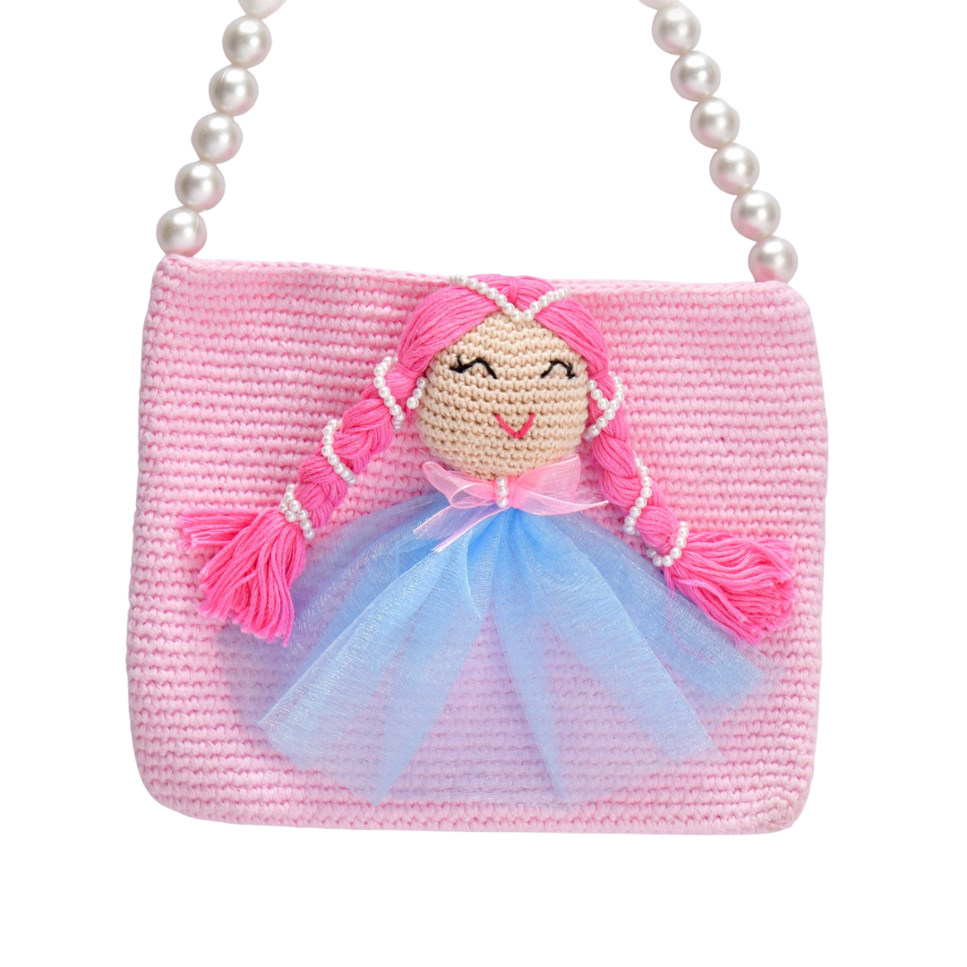 Handmade Crochet Doll Sling Bag with Pearl Handle | Cute Princess Crossbody Bag for Kids