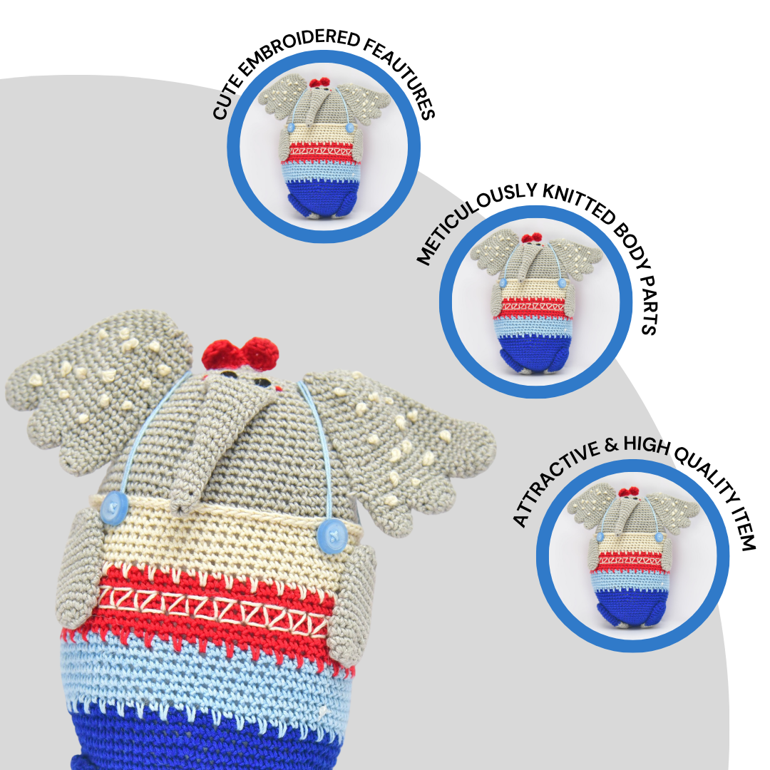 Say hello to Manny the Elephant — a lovingly handcrafted crochet toy that brings comfort, character, and charm to every cuddle. Soft, safe, and endlessly huggable, Manny is designed to accompany little dreamers on every adventure — from nap time to storytime. Each stitch is carefully woven by talented women artisans from underprivileged communities across India, turning yarn into joy and play into purpose. With Manny, every hug tells a story of love, imagination, and craftsmanship. 💛